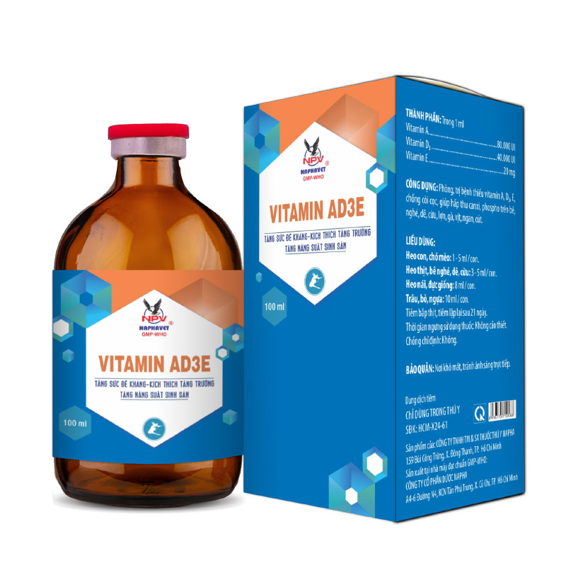 CÔNG DỤNG: Phòng, trị bệnh thiếu vitamin A, D3, E, chống còi cọc, giúp hấp thu canxi, phospho trên bê, nghé, dê, cừu, lợn, gà, vịt, ngan, cút.